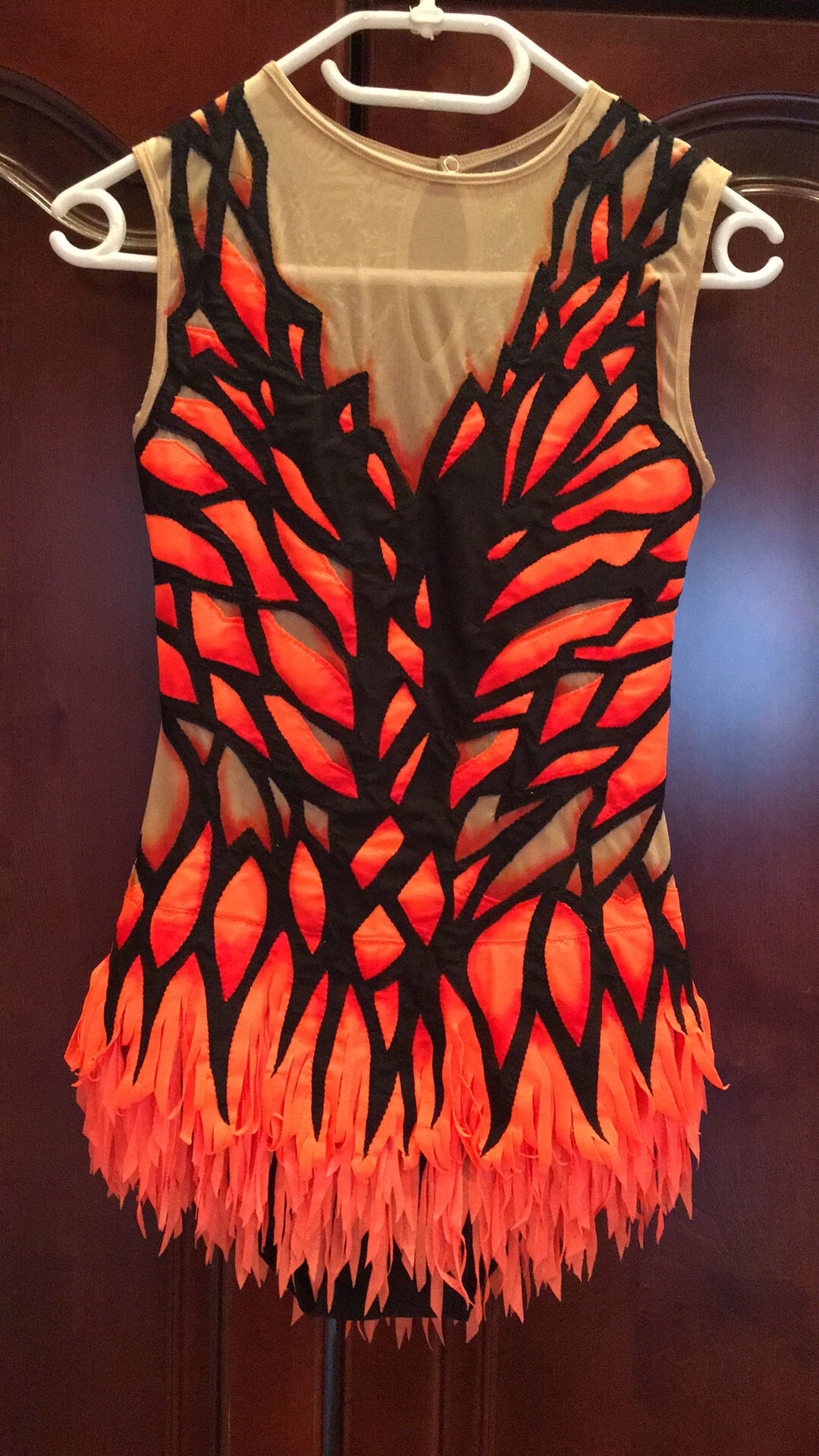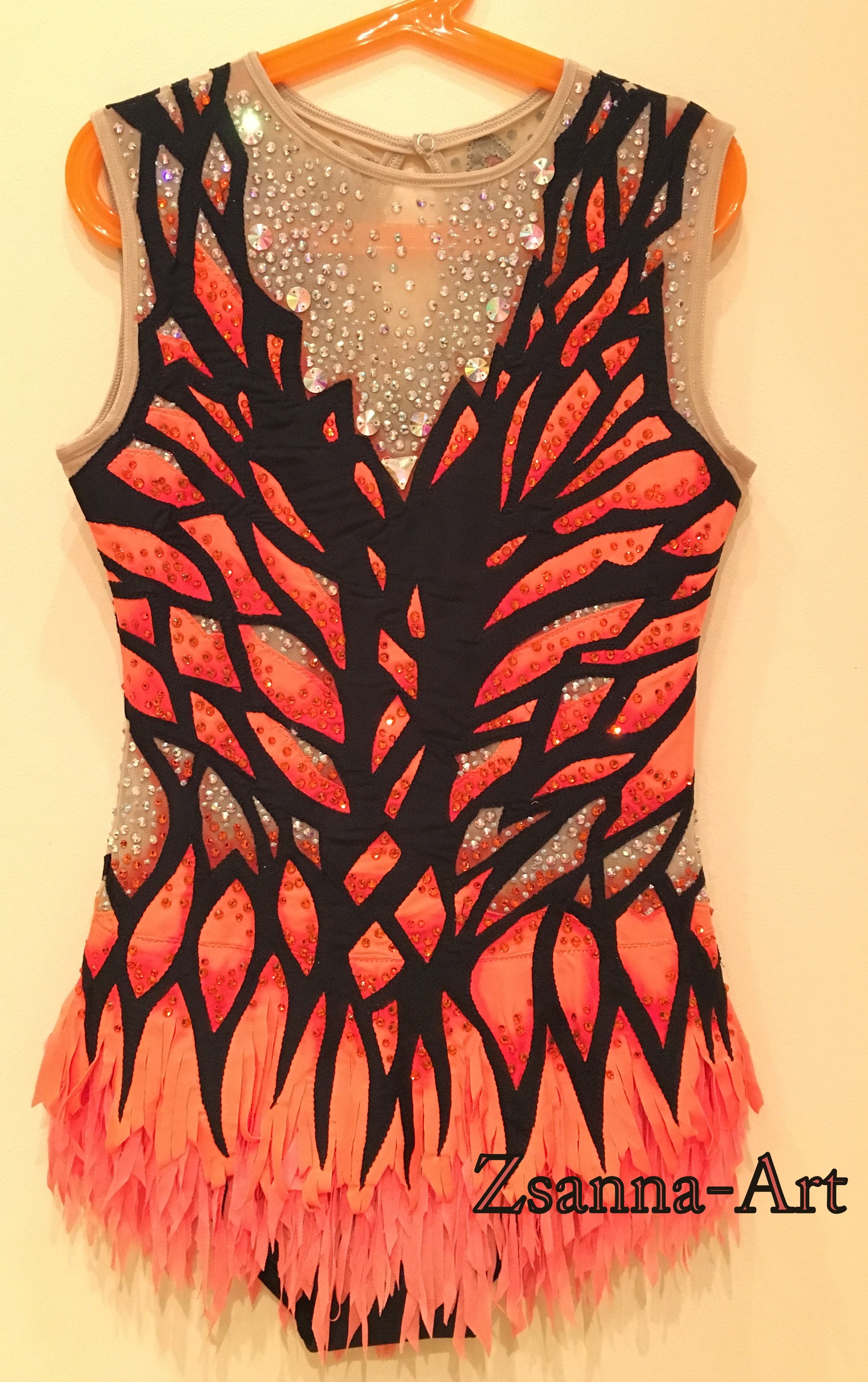 Hozott tervek alapján készült ez a gyönyörű, feltűnő, mutatós, festett, ritmikus gimnasztika versenydressz Petrának. Az alapdressz önmagában is nagyon mutatós volt, árnyékolással emeltem ki a foltok mélységét. Petra a dresszéhez illő neon narancs labdával versenyez. Az összhatás tökéletes!